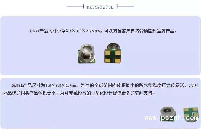 DA33/DA33L的压力量程为300mbar~1100mbar, 在-20℃到60℃温度范围内的压力精度为±2mbar(可为客户提供精度为±4mbar的更低成本产品),供电电压1.8V~5.5V, 数字I2C输出, 待机功耗低于0.1uA。