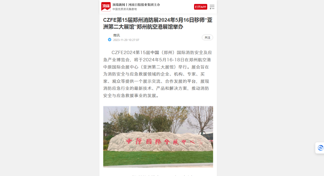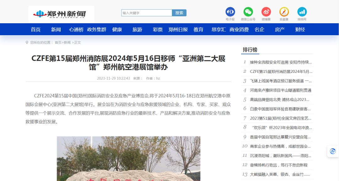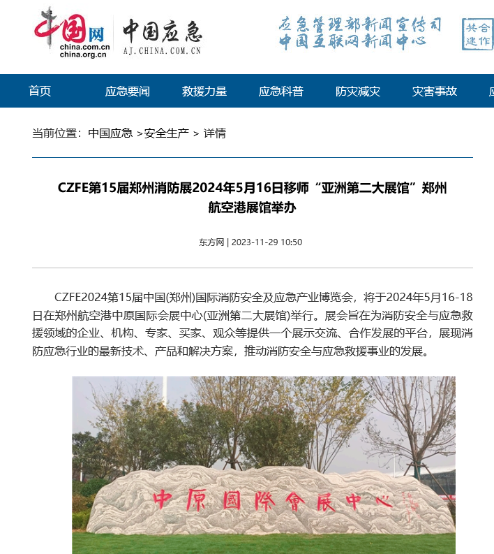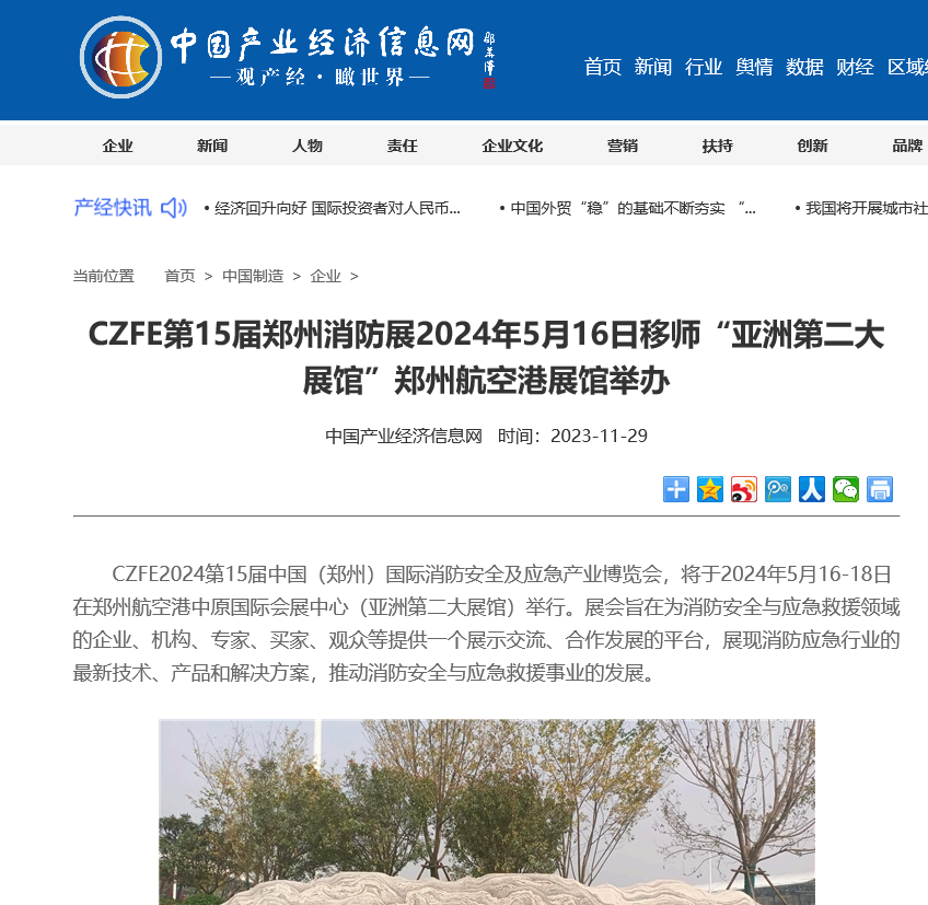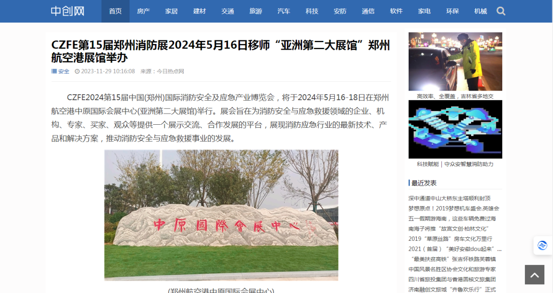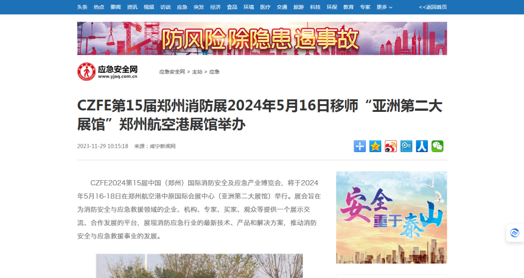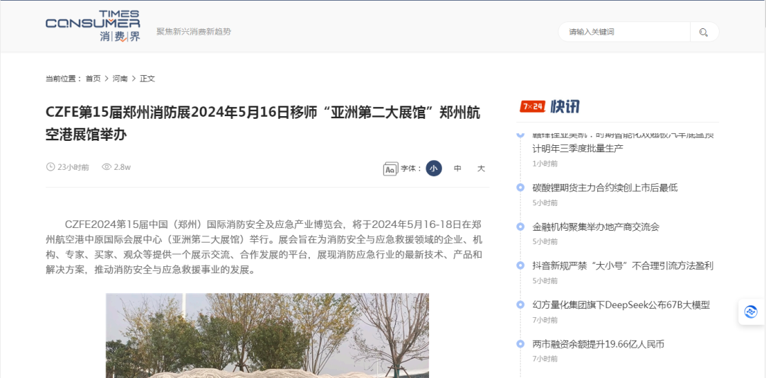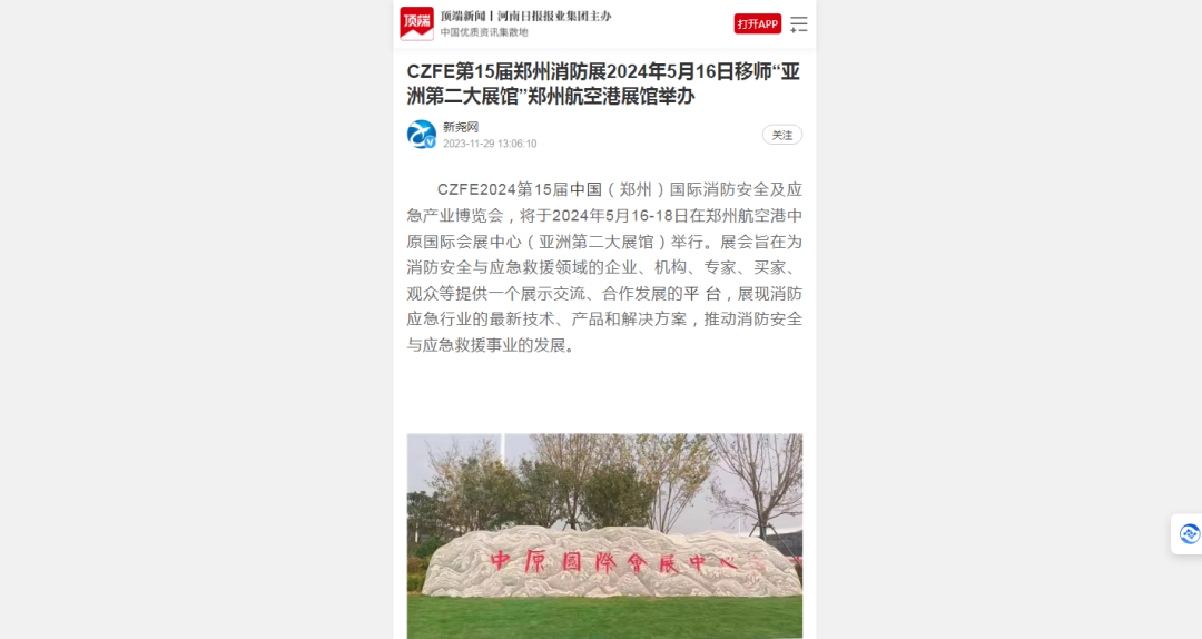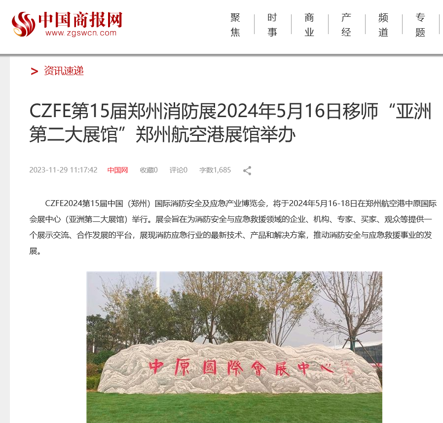 CZFE2024第15届郑州国际消防展自启动筹备至今,受到了媒体行业广泛关注,其中包括中国网应急、中国经济新闻网、凤凰网商业、中国日报、新浪新闻、中华网、中国商报、中国发展网、中国企业报、网易新闻、大众网、中国产业经济信息网、中宏网、环球网、中国经营网、人民日报客户端地方号随机、企业观察报、中国报道、中国财富网、极客网、顶端新闻(新尧网)、中原新闻网、河南广电网、郑州新闻网、科技新闻网(河南科技报)、信阳日报、商都网、中原传媒网、中华经济发展网、《消费界》河南、《大众商报》河南、印象河南网、焦作网、河南网首发、河南日报客户端官方(商讯)、商广网、郑州经济发展网、周口网、消防器材网(消防器材产业网)、中创网安全安防、中国应急安全网、中国消防网、中国安防网、安防资讯网、安防知识网、雪球网、今日头条、搜狐、知乎网、百度、商丘新闻网、中国财经时报网、中国焦点日报、时代商业网、爱云资讯、A5站长网、今报在线、中国消费新闻网等近百余家媒体网站的争相报道。