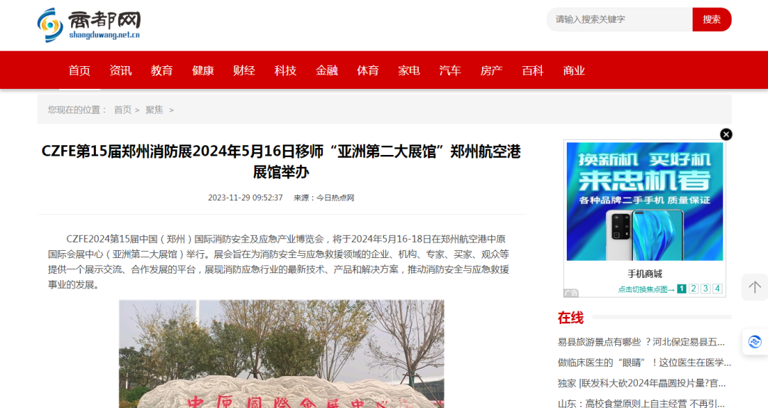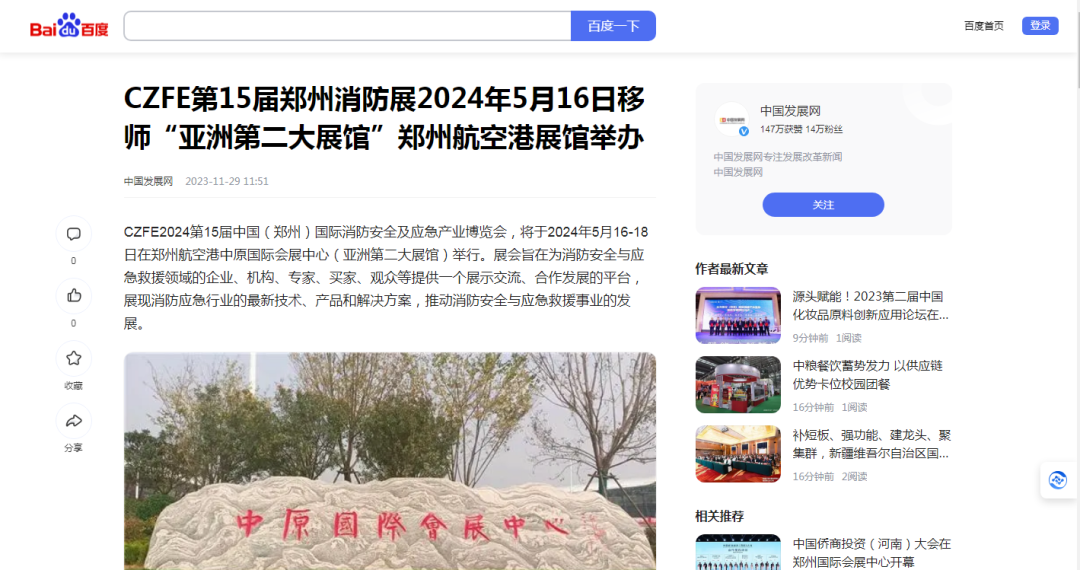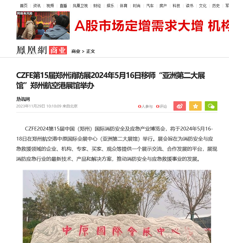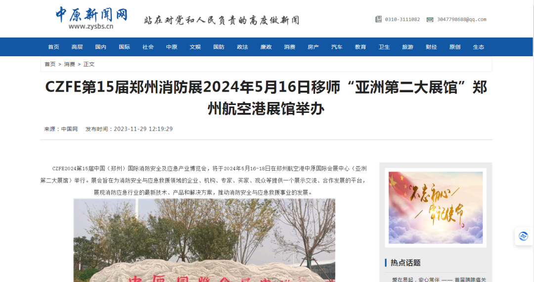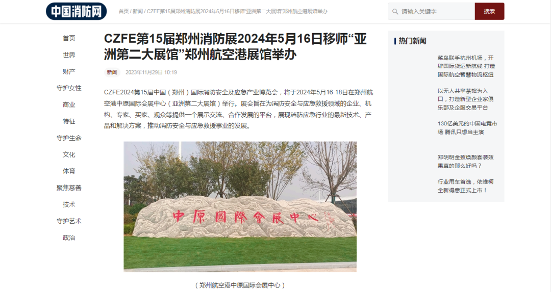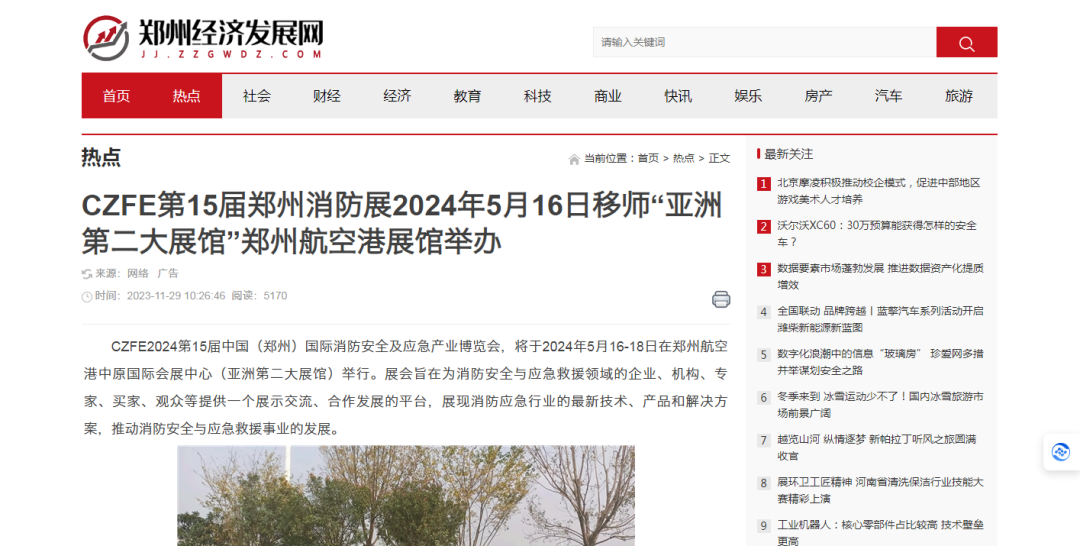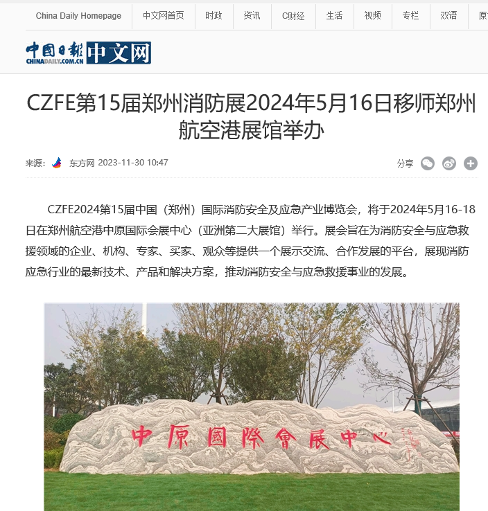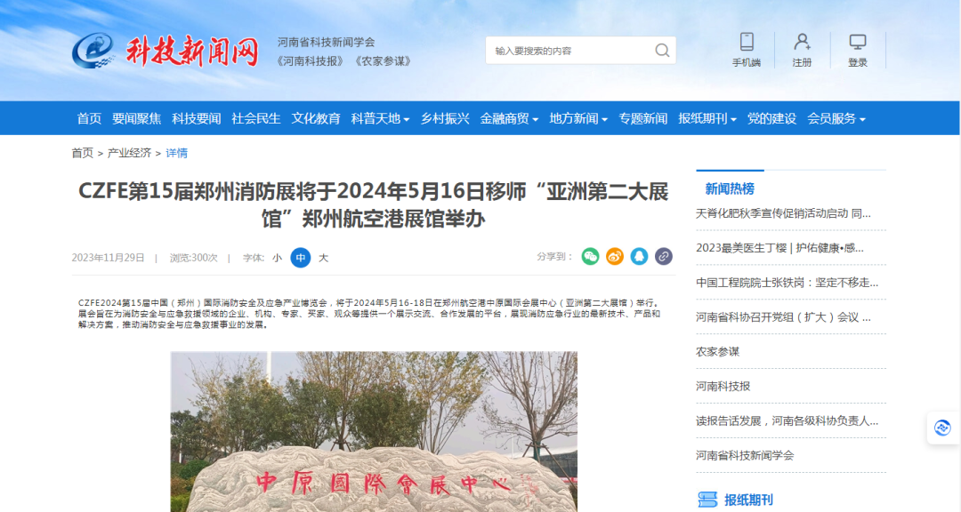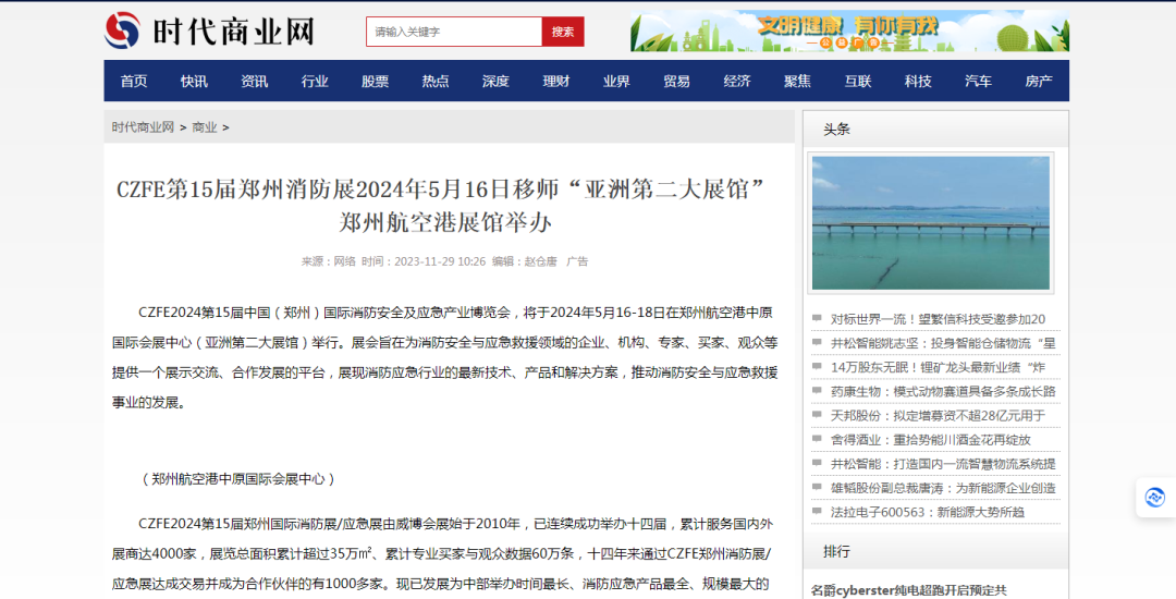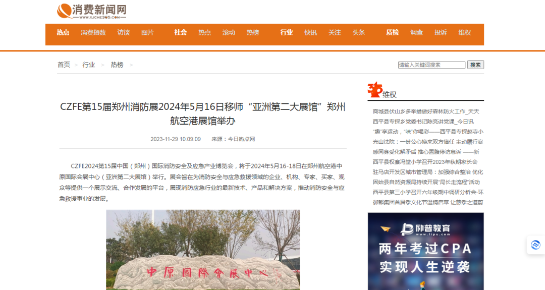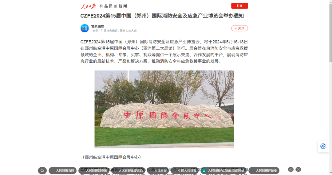 CZFE2024第15届郑州国际消防展自启动筹备至今,受到了媒体行业广泛关注,其中包括中国网应急、中国经济新闻网、凤凰网商业、中国日报、新浪新闻、中华网、中国商报、中国发展网、中国企业报、网易新闻、大众网、中国产业经济信息网、中宏网、环球网、中国经营网、人民日报客户端地方号随机、企业观察报、中国报道、中国财富网、极客网、顶端新闻(新尧网)、中原新闻网、河南广电网、郑州新闻网、科技新闻网(河南科技报)、信阳日报、商都网、中原传媒网、中华经济发展网、《消费界》河南、《大众商报》河南、印象河南网、焦作网、河南网首发、河南日报客户端官方(商讯)、商广网、郑州经济发展网、周口网、消防器材网(消防器材产业网)、中创网安全安防、中国应急安全网、中国消防网、中国安防网、安防资讯网、安防知识网、雪球网、今日头条、搜狐、知乎网、百度、商丘新闻网、中国财经时报网、中国焦点日报、时代商业网、爱云资讯、A5站长网、今报在线、中国消费新闻网等近百余家媒体网站的争相报道。