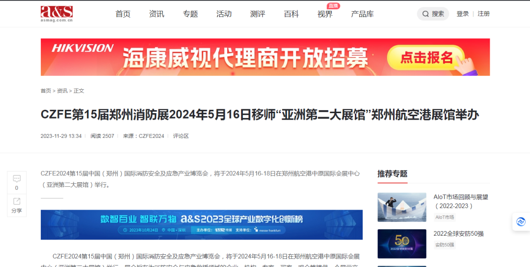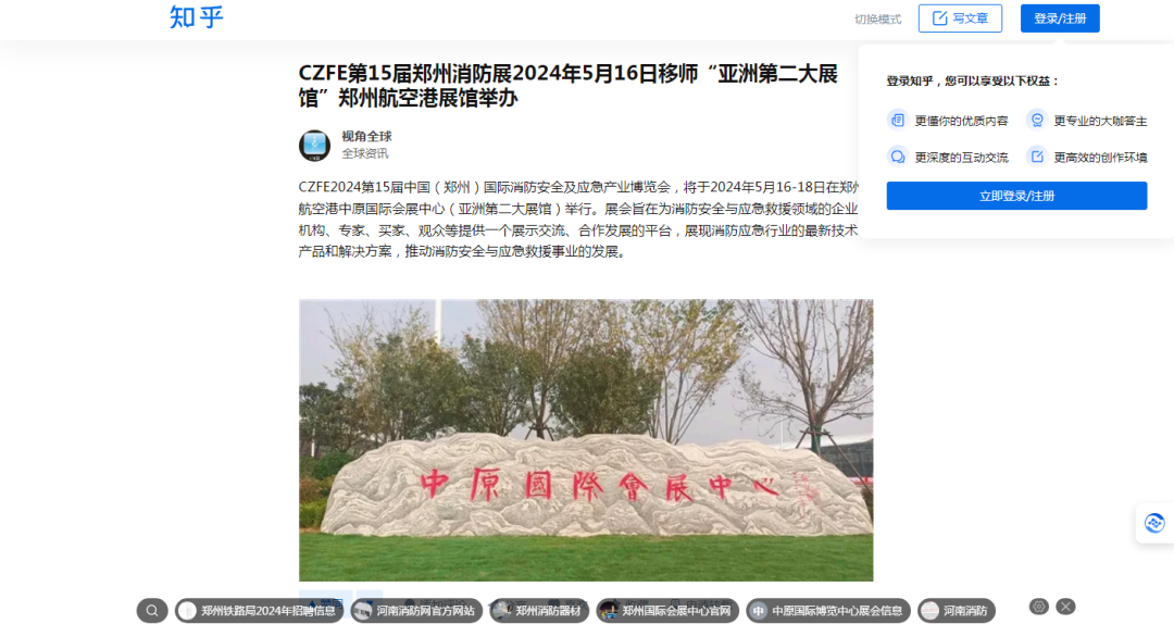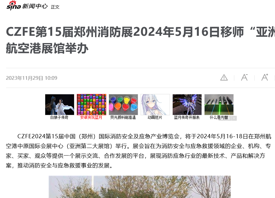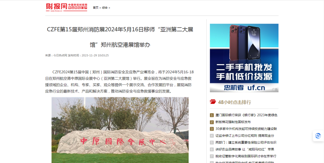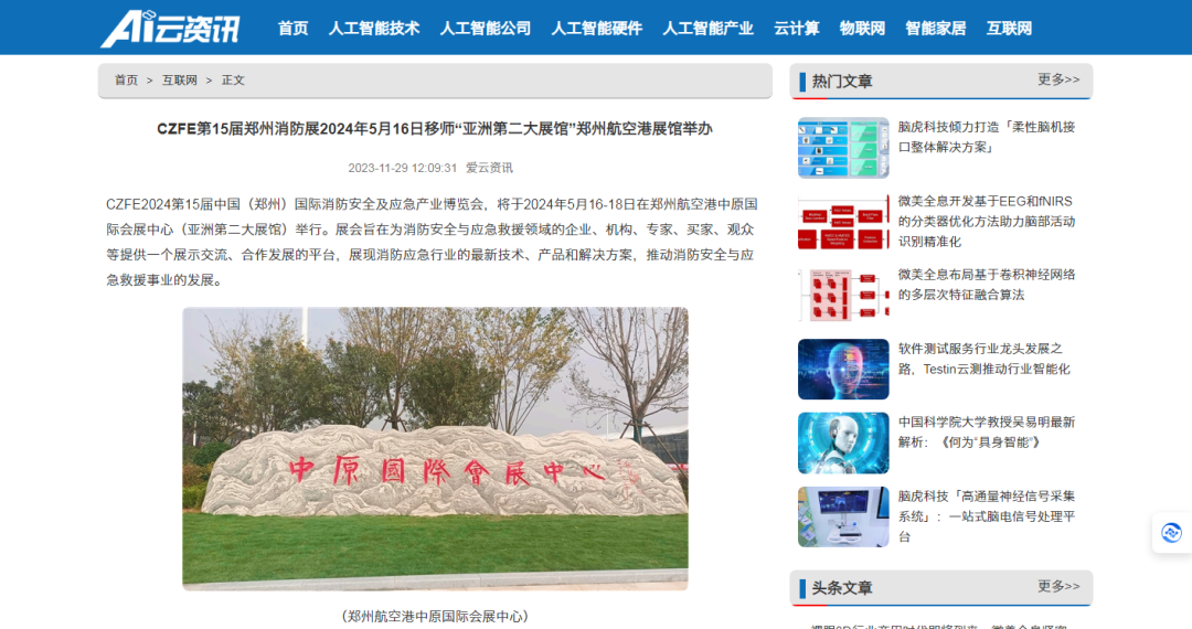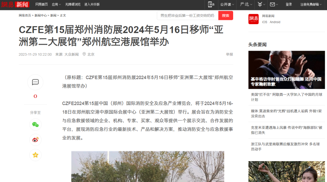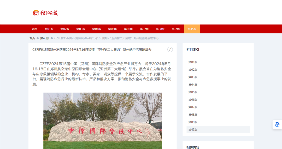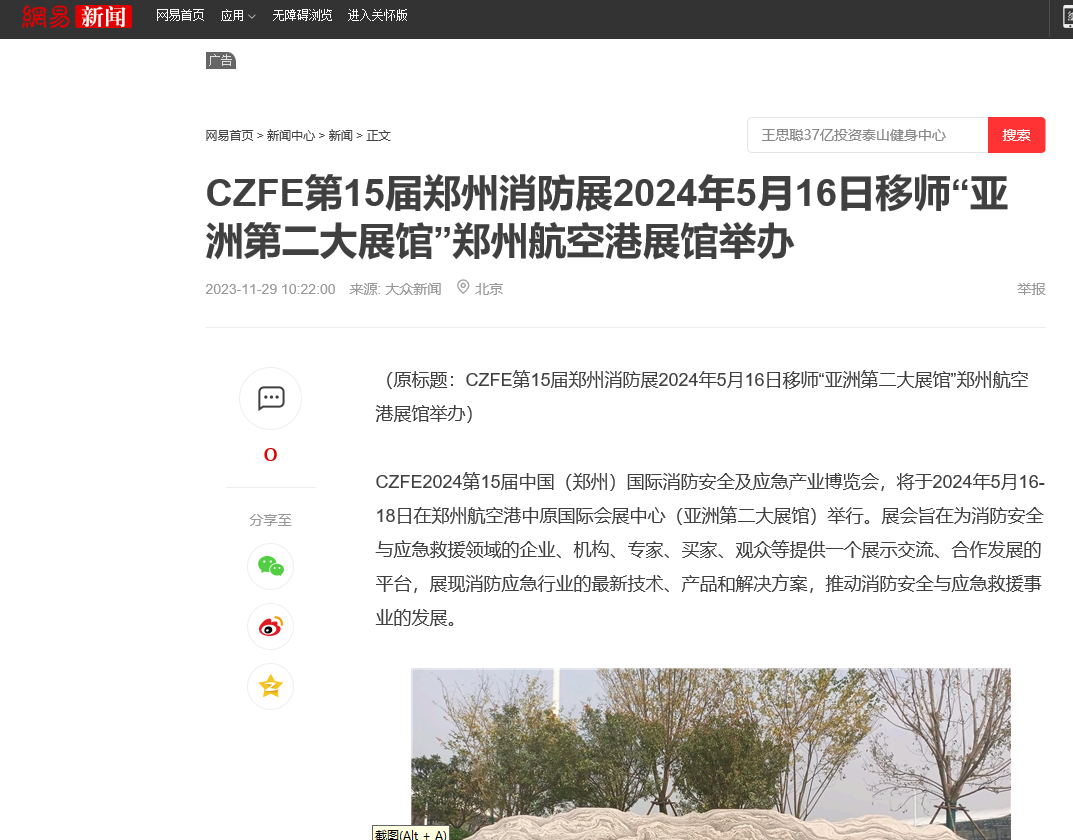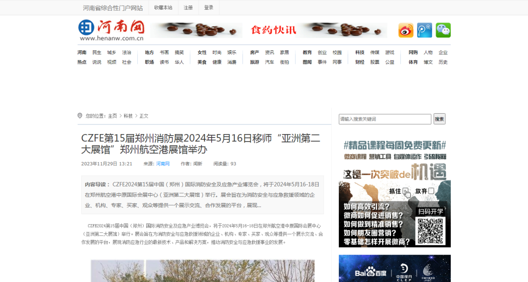 CZFE2024第15届郑州国际消防展自启动筹备至今,受到了媒体行业广泛关注,其中包括中国网应急、中国经济新闻网、凤凰网商业、中国日报、新浪新闻、中华网、中国商报、中国发展网、中国企业报、网易新闻、大众网、中国产业经济信息网、中宏网、环球网、中国经营网、人民日报客户端地方号随机、企业观察报、中国报道、中国财富网、极客网、顶端新闻(新尧网)、中原新闻网、河南广电网、郑州新闻网、科技新闻网(河南科技报)、信阳日报、商都网、中原传媒网、中华经济发展网、《消费界》河南、《大众商报》河南、印象河南网、焦作网、河南网首发、河南日报客户端官方(商讯)、商广网、郑州经济发展网、周口网、消防器材网(消防器材产业网)、中创网安全安防、中国应急安全网、中国消防网、中国安防网、安防资讯网、安防知识网、雪球网、今日头条、搜狐、知乎网、百度、商丘新闻网、中国财经时报网、中国焦点日报、时代商业网、爱云资讯、A5站长网、今报在线、中国消费新闻网等近百余家媒体网站的争相报道。