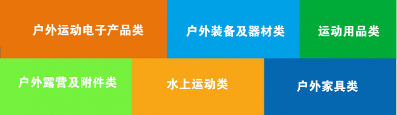 3、户外露营及附件类展区:长途旅游、户外房车、太阳能背包、登山包、急救包、指南针/定位系统、炊具/燃料、急救用品、应急灯、登山鞋,徒步鞋,高山靴,攀岩鞋,沙滩鞋/凉鞋、户外休闲鞋、户外手电筒、护具、户外水壶、头盔、防潮垫、地席水壶、水具炉具、烧烤炉、通讯/导航、户外刀具、户外表、射击、望远镜、登山杖、手杖毛巾、户外移动电源等