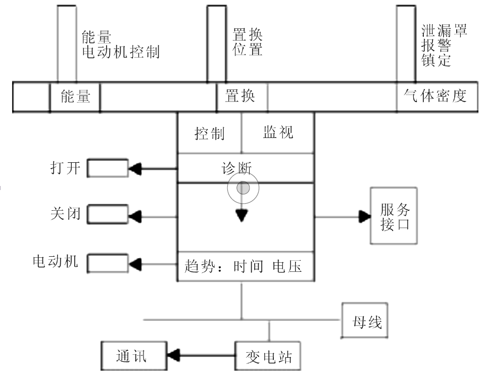 图1概要说明了一种兼有计算机系统和传感装置的智能化断路器工作原理。主要的传感器可探明气体密度,通过监控其运动和能量变化,反映操作机构状态。气体密度传感器发出的信号能够实现连续的状态监测,确定趋势走向以及检测极限值,并能在此基础上实现常规的SF6气体的锁定和报警功能。同样,在运动传感器和能量传感器的帮助下,操作机构的状态可实现监控。另外,这些传感器的信号可同时用于常规的位置指示和电动机控制功能上。