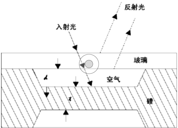 图3是采用对温度敏感的Fabry-perot槽研制出的一种温度探头,Fabry-perot槽温度探头原理图如图3所示。装置由一薄硅片构成,在它中段的顶部和底部蚀刻出矩形槽,然后在薄硅片顶粘贴上一层玻璃,该玻璃的热膨胀系数与硅片的热膨胀系数不同。当该处温度变化时,因2种材料不同的热膨胀系数,在其内部产生内应力,内应力改变槽的深度。用光纤将多色光送入Fabry-perot槽,反射出的调制光也经光纤送出,调制的输出信号是用光学干涉测量方法测量的。