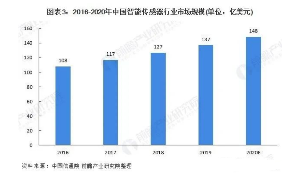 ⒊中国智能传感器市场规模持续上升根据中国信通院的数据,中国智能传感器市场规模从2015年的106亿美元上升至2019年的137亿美元,我国智能传感器产业生态逐渐趋于完备,设计制造,封测等重点环节均有骨干企业布局。2020年,中国智能传感器行业市场规模在148亿美元左右。