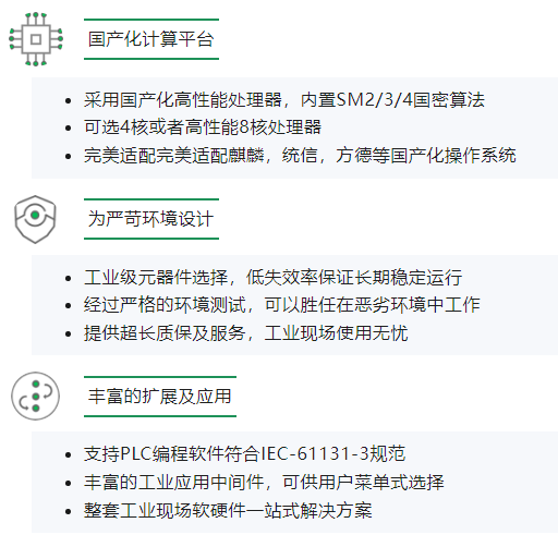 设备可选配搭载PLC工业编程环境,及深度神经网络、运动控制、工业通信协议、工业安全、实时数据库等多种软件或中间件模块。可广泛应用于智能制造、工业控制、机器视觉、智能交通、机械自动化、安防监控、教育培训、通讯及信息采集等场景。