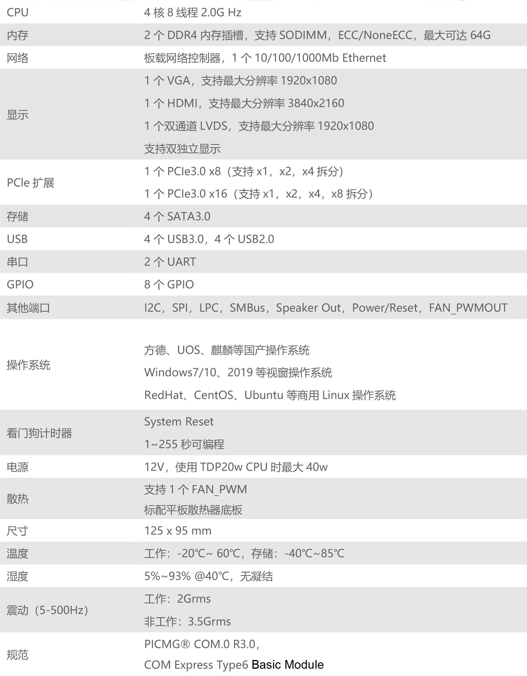 基于国产高性能处理器的COMe Type6核心板。产品采用国产高性能4核处理器,支持标准Type6 COMe结构及接口总线,有较强的通用性。配合使用其他国产操作系统,实现平台的稳定、可靠运行。