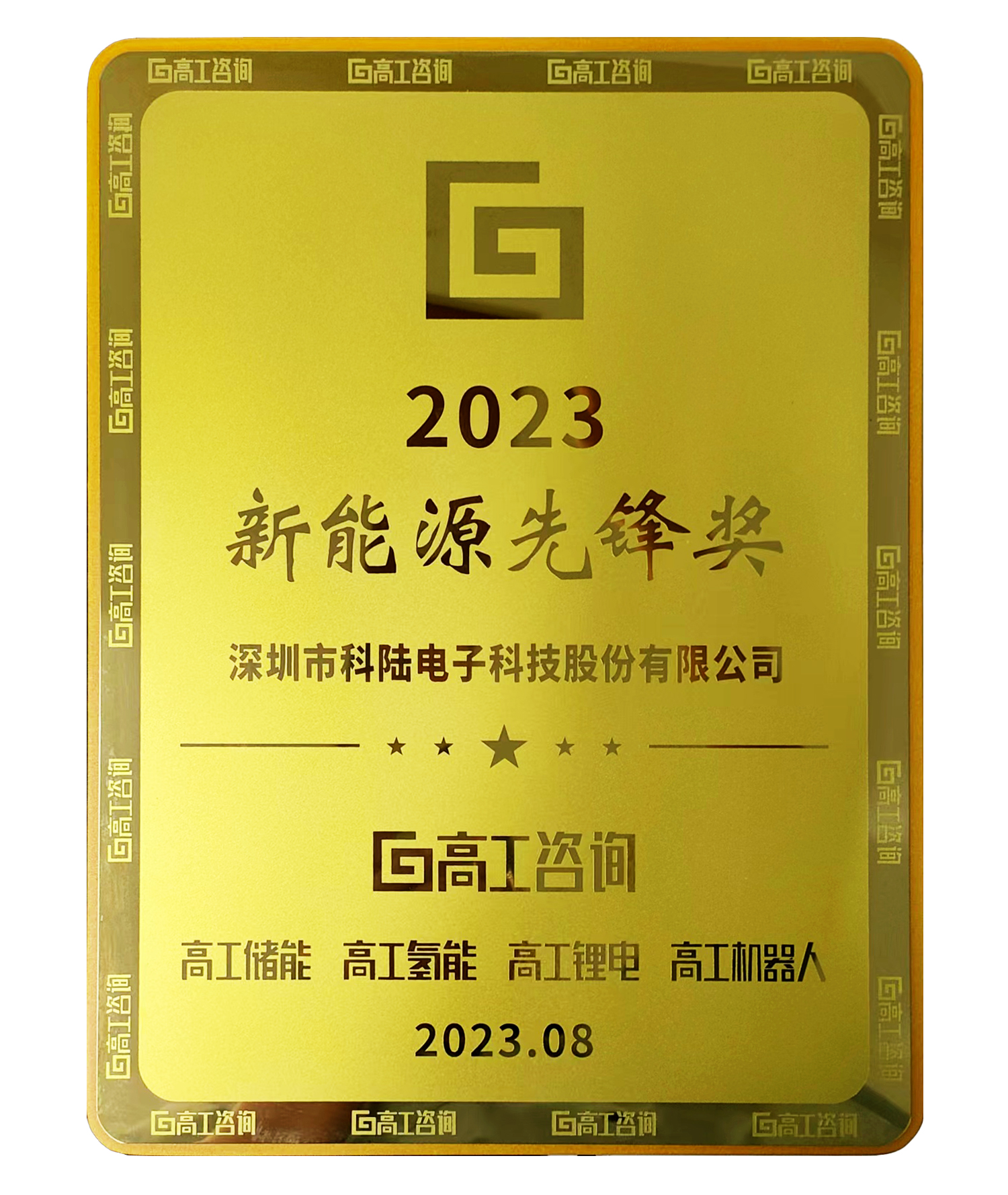 为打造光储交流合作平台,推动产业发展,高工咨询旗下高工产业研究 院(GGII)、高工储能、高工锂电、高工氢能、高工机器人于 2023 年 8 月 3 日至 4 日举办“2023 高工光伏新型储能大会”。科陆受邀出席本次大会,并荣获由高工储能、高工产研(GGII)举办的光伏、储能行业权威年度评选“2023 新能源先锋奖”荣誉。