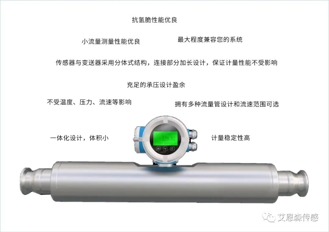 ● 直接测量质量流量, 不受温度、压力、流速等影响,可显示质量流量、体积流量、累计 流量、密度、温度等参数。