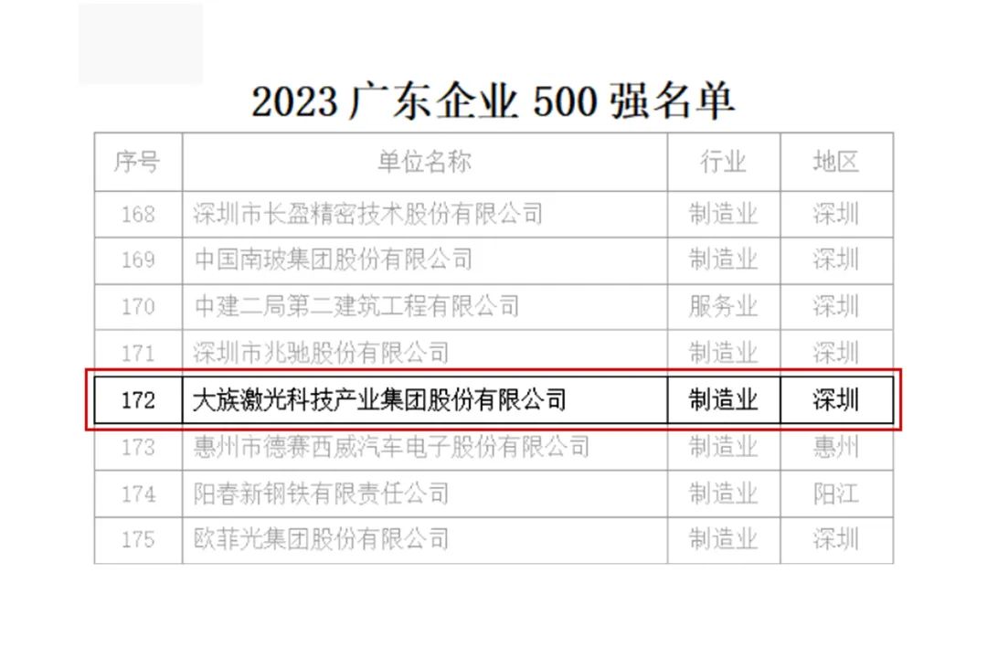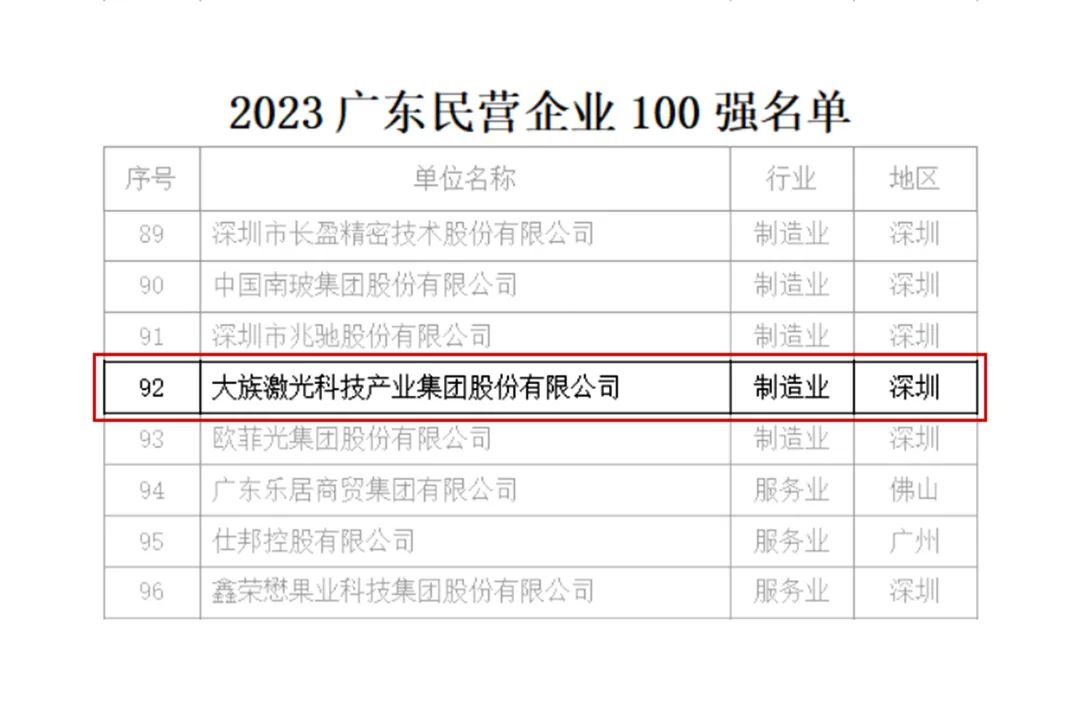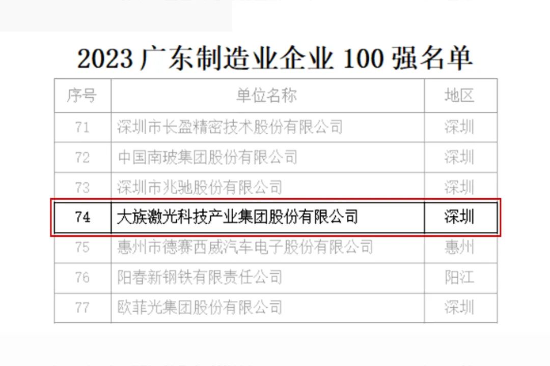 近日,广东省企业联合会、广东省企业家协会在广州举办2023广东500强企业发展大会,此次大会以“强化龙头引领,推动产业升级”为主题,正式发布2023广东企业500强榜单。大族激光凭借雄厚的综合实力和稳健表现,入围广东企业500强,同时上榜2023广东省民营企业100强和2023广东省制造业民营企业100强,分别位列92名、74名。