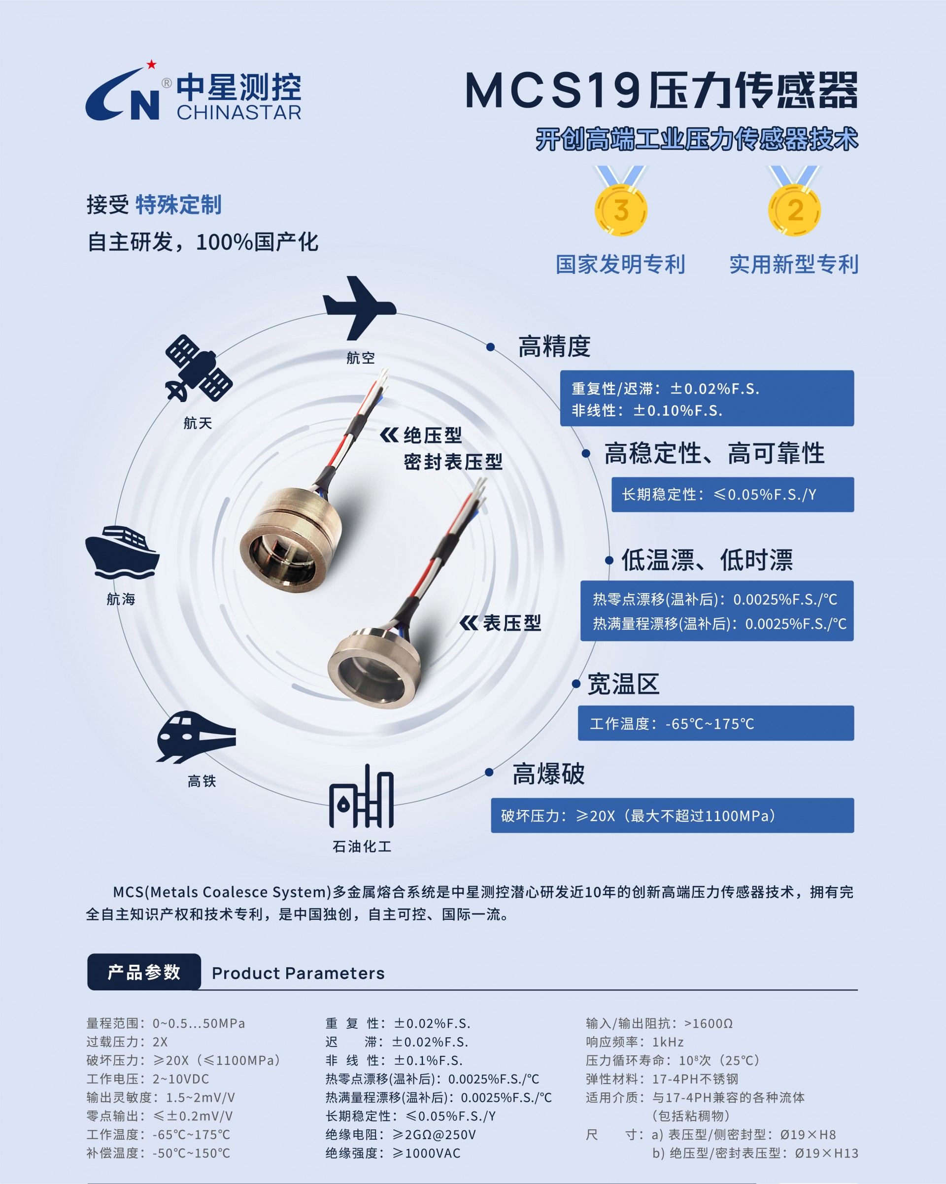 中星测控潜心研发多年的MCS(多金属熔合系统)高端压力传感器,拥有完全自主知识产权和技术专利,自主可控、100%国产化,填补了国内高端压力传感器市场的空白,解决了“卡脖子”问题。与其他常见的压力传感器相比,它具有高精度、高稳定性、高可靠性、低温漂、低时漂 、宽温区、高爆破等特点。