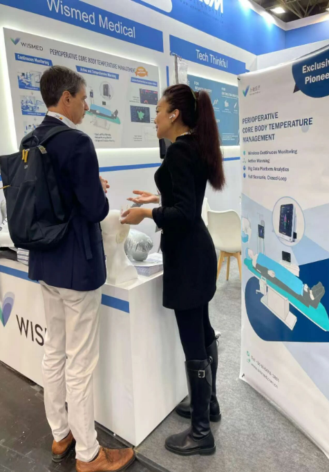 为麦智能科技(北京)有限公司(以下简称“为麦医疗”)展区的工作人员现场模拟了“新一代智能全自动化围术期体温管理解决方案”的临床应用。该方案采用创新的“四合一综合式升温管理”设计,将医用升温毯、输血输液加温仪、末梢循环加热装置与控制主机高度集成,形成一套协同运作的升温系统。其通过无线可穿戴体温传感器与复合式升温设备的智能联动,构建了完整的测温保温闭环管理体系,能够在监测到患者体温异常时自动开启保温设备,并根据患者与目标体温的差值自动调整加热曲线,实现预测式升温管理。