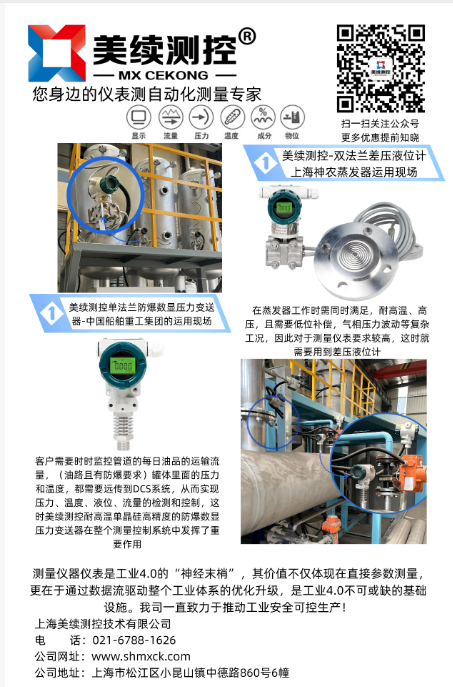 上海美续测控凭借在工业测控技术领域近十年的深耕,携自主研发的压力变送器、温度传感器、流量计、差压变送器等全系列高精度仪器仪表重磅登场。这些专为蒸发结晶工艺复杂工况设计的核心产品,具备耐高温、抗腐蚀、长期稳定性强的特点,能够实时监测蒸发器内压力波动、温度梯度、流体流量及差压变化,为工艺优化提供精准数据支撑,显著提升生产效率与资源利用率