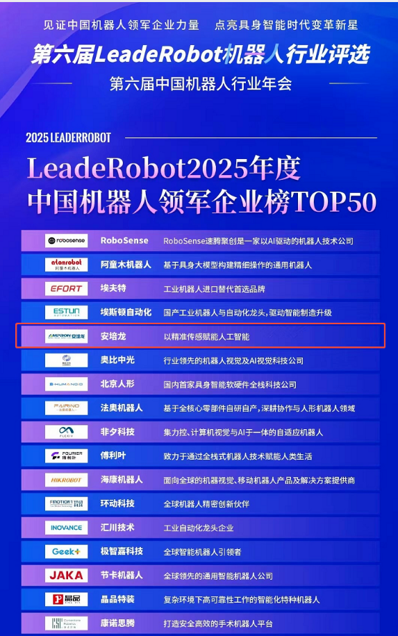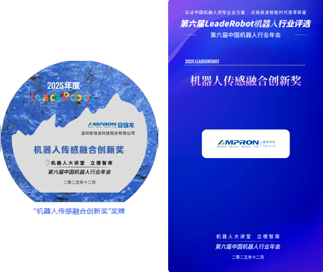 2025年12月18日,第六届中国机器人行业年会在杭州滨奥皇冠假日酒店隆重召开。本届年会以“见证中国机器人领军企业力量,点亮具身智能时代变革新星”为主题,汇集了产业链上下游众多核心企业、专家学者与行业领袖。本次盛会中,深圳安培龙科技股份有限公司凭借在机器人力传感领域持续的技术创新及突破,同时荣获大会两项重磅荣誉:“机器人传感融合创新奖”与“LeadeRobot 2025年度中国机器人领军企业榜TOP50”。这一双重荣誉加冕,有力印证了安培龙力觉传感技术在机器人领域的技术领先性与市场影响力。