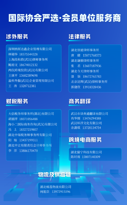 参加活动的企业还有:副会长单位大信税务师事务所(湖北)有限公司总经理王庆华、上海段和段(武汉)律师事务所易倩;理事单位两仪跨境投资(武汉)有限公司项目经理洪龛、武汉沃隆通信技术有限公司CEO律国军;会员单位湖北数智军科技有限公司总经理袁智、湖北瀚宇国际物流服务有限公司武汉分公司负责人袁徐恩、武汉咻唰外贸服务有限公司销售总监翟英健、随州市星瑞矿业有限公司叶星辰;鼎润咨询合伙人陈优丽。
