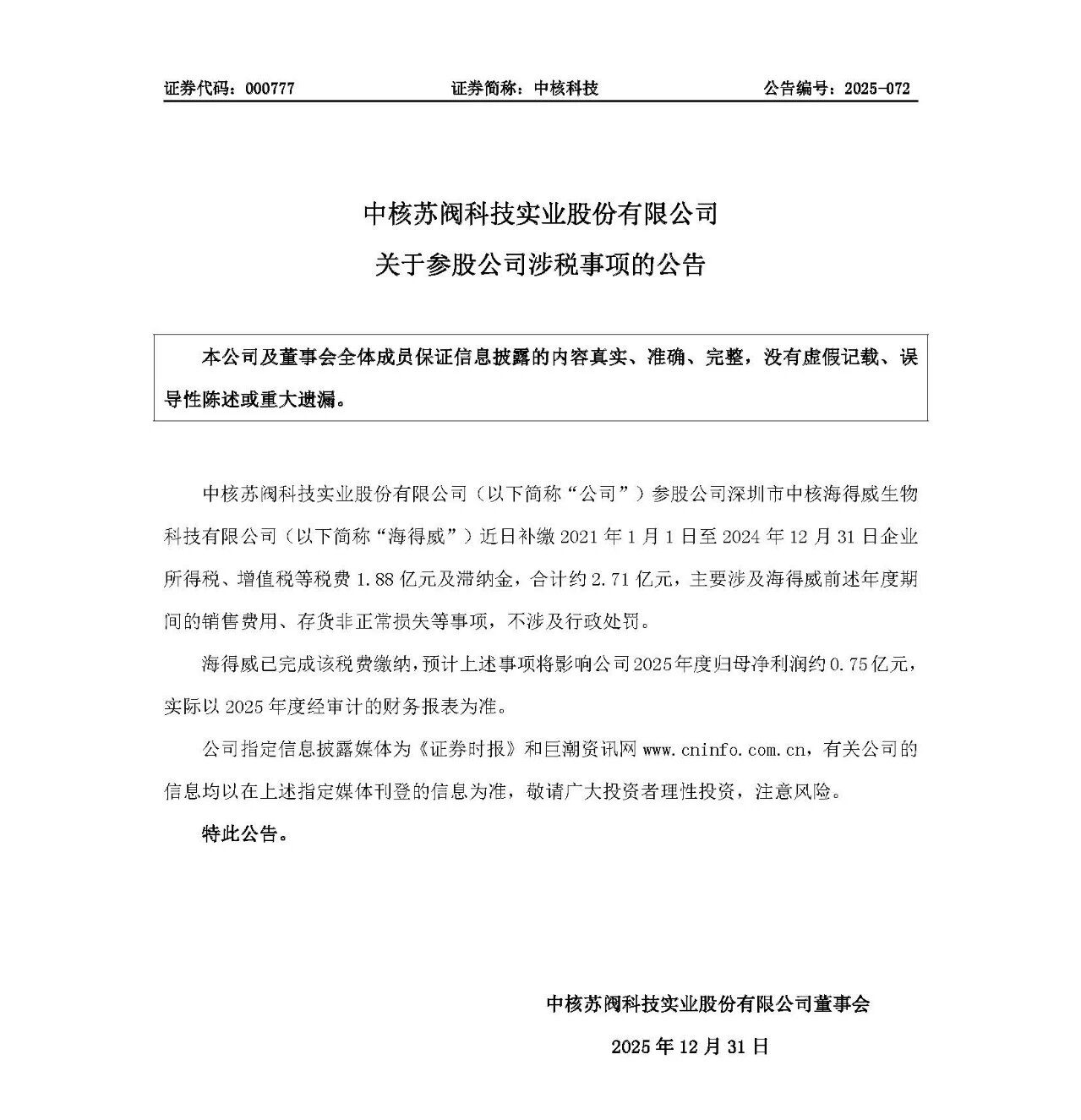 中核科技公告,中核苏阀科技实业股份有限公司参股公司深圳市中核海得威生物科技有限公司近日补缴2021年1月1日至 2024 年12 月31 日企业所得税、增值税等税费1.88亿元及滞纳金,合计约2.71亿元,主要涉及海得威前述年度期间的销售费用、存货非正常损失等事项,不涉及行政处罚。