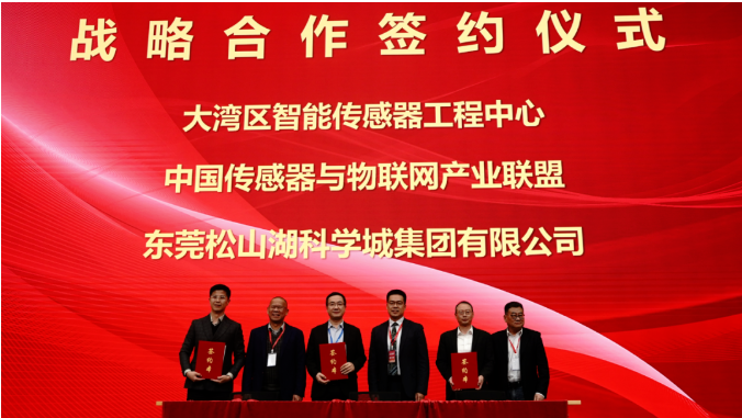 大会重要环节,⼤湾区智能传感器⼯程中⼼、中国传感器与物联⽹产业联盟、松⼭湖科学城集团有限公司举行了战略合作签约仪式,标志着三方将在技术研发、成果转化、产业培育等领域开展深度协同,共同推动松山湖智能传感器产业生态的完善。