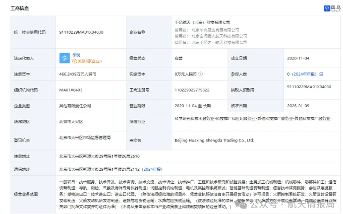 从公开数据可查,千亿航天成立于2020年11月,实缴资本0元,参保人数0元,法定代表人及最终收益人为李锐。2024年,千亿航天与宇航推进完成发动机采购协议签署,与光年探索完成箭体主结构采购协议签署。