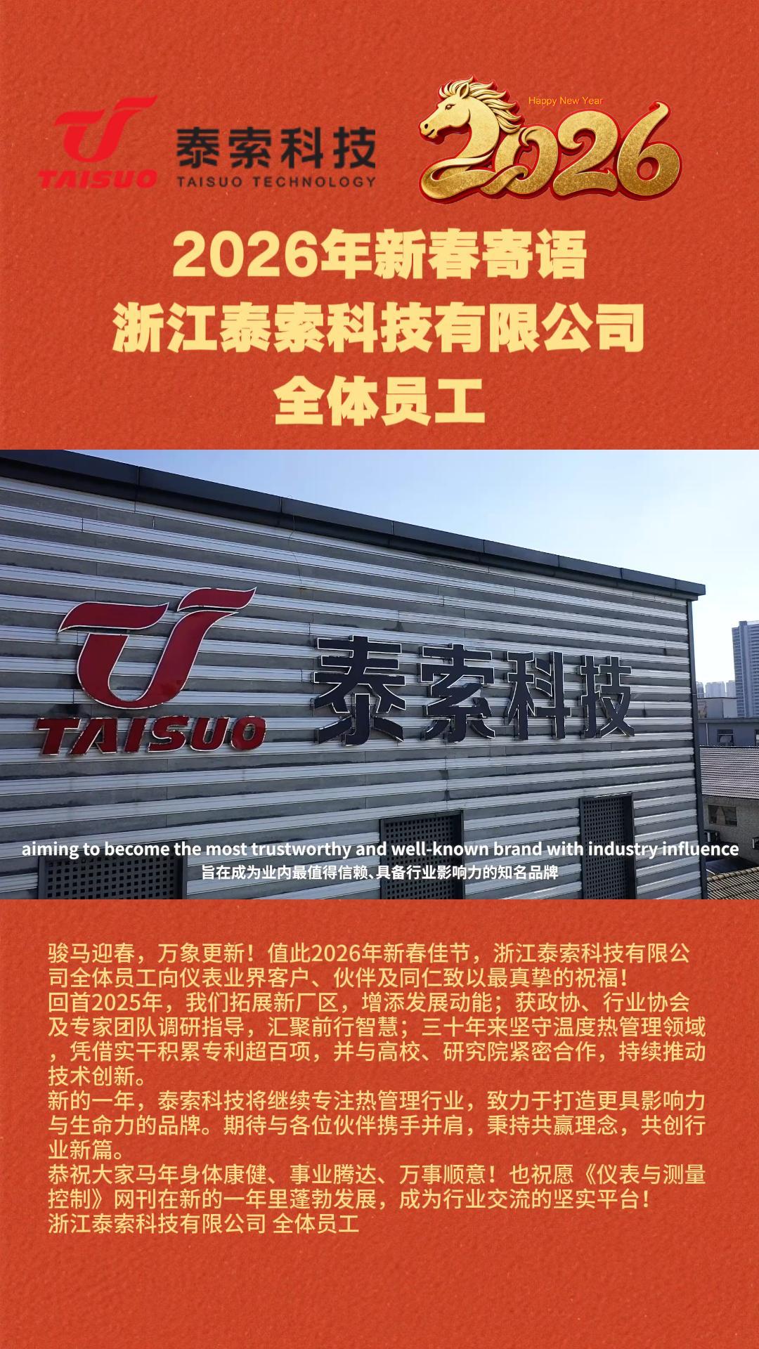 骏马迎春,万象更新!值此2026年新春佳节,浙江泰索科技有限公司全体员工向仪表业界客户、伙伴及同仁致以最真挚的祝福!