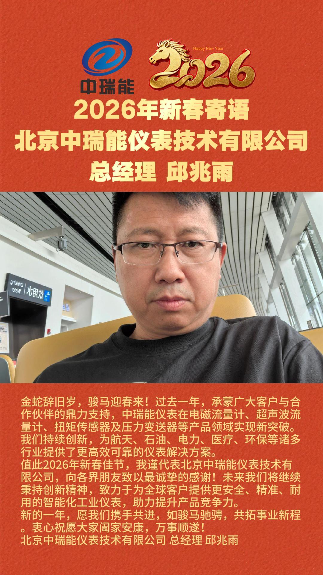 值此2026年新春佳节,我谨代表北京中瑞能仪表技术有限公司,向各界朋友致以最诚挚的感谢!未来我们将继续秉持创新精神,致力于为全球客户提供更安全、精准、耐用的智能化工业仪表,助力提升产品竞争力。
