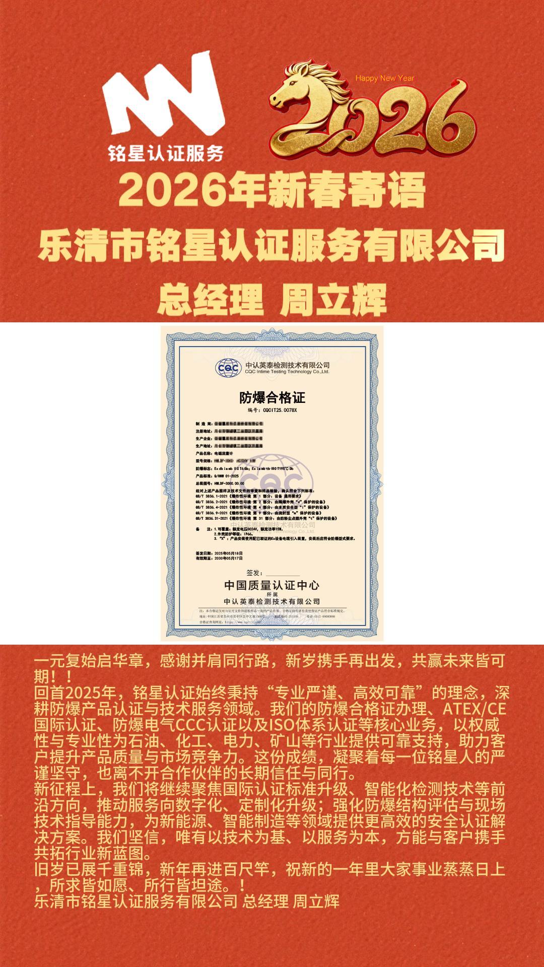 回首2025年,铭星认证始终秉持“专业严谨、高效可靠”的理念,深耕防爆产品认证与技术服务领域。我们的防爆合格证办理、ATEX/CE国际认证、防爆电气CCC认证以及ISO体系认证等核心业务,以权威性与专业性为石油、化工、电力、矿山等行业提供可靠支持,助力客户提升产品质量与市场竞争力。这份成绩,凝聚着每一位铭星人的严谨坚守,也离不开合作伙伴的长期信任与同行。