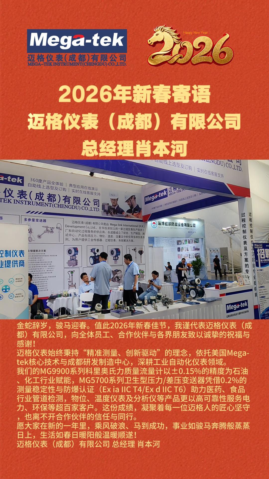 金蛇辞岁,骏马迎春。值此2026年新春佳节,我谨代表迈格仪表(成都)有限公司,向全体员工、合作伙伴与各界朋友致以诚挚的祝福与感谢!
