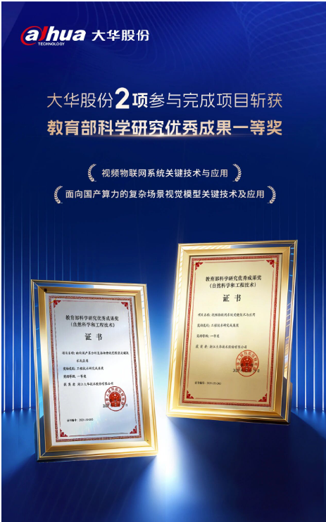 近日,2025 年度教育部科学研究优秀成果奖(自然科学和工程技术)获奖名单正式揭晓。大华股份参与完成的“面向国产算力的复杂场景视觉模型关键技术及应用”、“视频物联网系统关键技术与应用”两个项目,双双斩获工程技术研究成果奖一等奖。