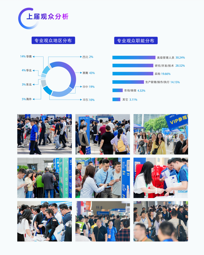 精准观众邀约:组委会定向邀请石油化工、汽车制造等重点领域企业,以及大专高校、科研院所的核心决策人群,观众地域覆盖西南、华中、华南等地及海外。
