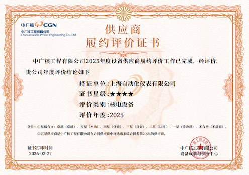 近日,中广核工程有限公司(以下简称“中广核”)完成2025年度设备供应商履约评价,上海自仪凭借稳定可靠的产品质量、高效规范的履约能力和专业贴心的技术服务,荣获“四星(优秀)供应商”称号。该评价体系覆盖综合实力、质量管控、项目交付与现场服务等关键维度,是核电行业极具权威性的考核标准。