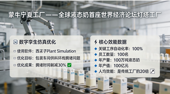 这一解决方案的价值已获得市场验证——百事公司已使用Digital Twin Composer对其美国工厂升级进行仿真,并计划在全球范围内推广。借助Digital Twin Composer,企业可为任意产品、流程或工厂创建虚拟3D模型,并将其置入自选3D场景;还可实现时序回溯与推演,精准呈现从设计到运营的全过程变化。该解决方案将于2026年中正式登陆西门子Xcelerator Marketplace。作为全球首座成功获得世界经济论坛“灯塔工厂”称号的液态奶工厂,蒙牛宁夏工厂采用西门子工厂仿真软件Plant Simulation打造了精准的数字孪生模型。通过对包装车间供料环线拥堵问题的仿真推演与优化,物料配送拥堵时间成功削减30%。工厂关键工序实现100%自动化,仅需100名员工即可创造100万吨产量与100亿元年产值,人均效能是传统工厂的20倍。在刚刚落幕的西门子RXD大会上,上海精智旗下子公司上海蓝沃凭借极致的产品力,成为全场唯一获邀的“AI原生工厂”科技伙伴,与西门子正式签署战略合作协议。其推出的「沃慧排」AI排产智能体,深度融合深度强化学习与运筹优化两大技术,在西门子强大的底层算力与生态资源加持下,实现了从计划到执行的毫秒级闭环反馈与自主进化。西门子在中国构建了由20个研发中心、17个生产制造基地以及20多个数字化创新赋能中心组成的全方位生态体系,覆盖超5万家客户和近万家供应商。- 3月,发布“中国加速2.0”智能制造创新产品发布会,发布18款面向中国市场的新品,其中16款实现全面本土研发