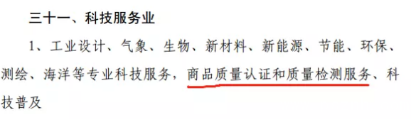 认证君查阅《产业结构调整指导目录(2019年本,征求意见稿)》全文,质量认证和检验检测服务、标准化服务、计量测试等被列入鼓励类第三十一大类科技服务业第一小类。截图如下: