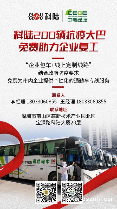 深圳市中电绿源纯电动汽车运营有限公司是拥有600辆纯电动大巴的专业运营公司,首批调配出车况最好的200辆大巴,采用“企业包车+线上定制线路”的方式,结合政府防疫要求,免费为市内企业提供个性化的通勤车专线服务,减少企业员工乘坐公共交通工具的交叉感染风险。