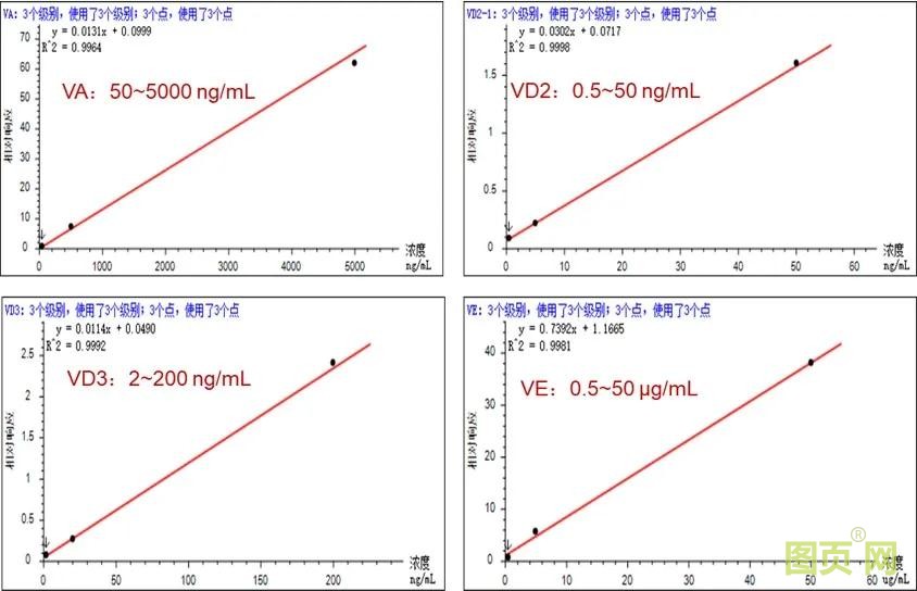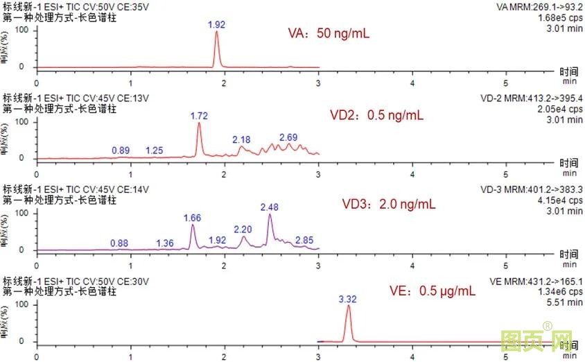 EXPEC 5210 针对维生素ADE的检测采用梯度洗脱条件,在缩短分析时间的同时获得了较好的去介质及分离效果,一针进样可得到VA、25-OH-VD2、25-OH-VD3、VE检测结果,满足临床的高通量需求。同时在前处理过程中添加同位素内标后,消除了不同基质样本中内源性物质对检测物的影响,大大提高了检测结果的准确性。