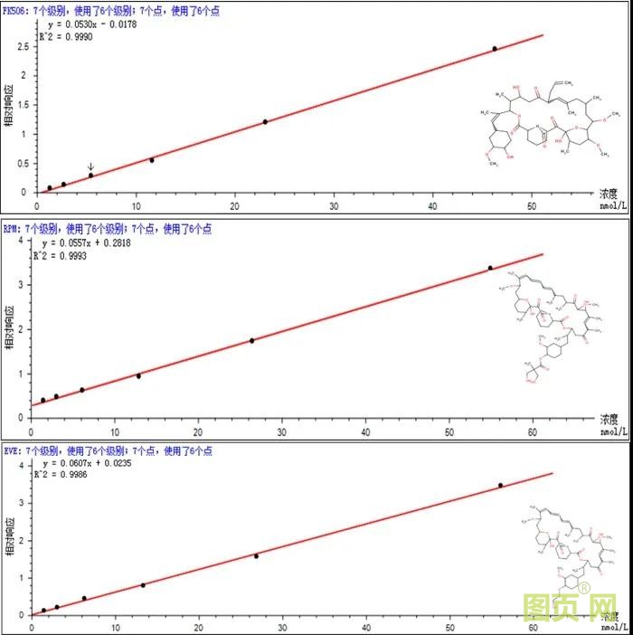 免疫抑制剂因其治疗窗窄,在临床应用中需进行治疗药物监测,所测值作为临床评价疗效及毒副反应的指标。传统免疫学方法进行血药浓度监测时特异性较差,不能完全区分免疫抑制剂与其代谢物;再者,其较大的分子量也加大了监测难度。EXPEC 5210可实现3min内完成3种免疫抑制剂——他克莫司、西罗莫司、依维莫司的浓度监测,线性、重复性良好。