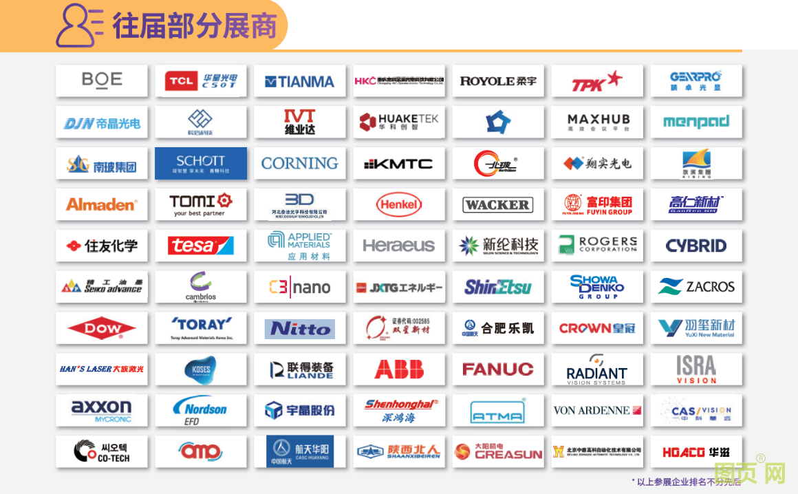 触控显示设备类展商德国冯阿登纳、安达自动化、鼎力自动化、深鸿海、联得装备、中电科风华、霍廷格电子、海峰机器人、ISRA VISION、申克博士、中科慧远、瑞淀光学、柯尼卡美能达、高凯精密、大族粤铭、上方装备、宏大真空、国泰真空、上银科技、广东速美达、广州晶泰科技;材料类展商德国汉高、日本艾迪科、赛伍技术、富印胶粘、乐凯新材、瑞康真空、罗杰斯公司、中山智隆、帝国油墨、精工油墨、高仁新材、一鑫新材、派乐玛、厦门韦尔通、江苏日久光电、汇驰新材等一大批知名企业也将亮相展会现场。它们通过在显示模组、玻璃基板、液晶材料、制造设备等领域的“深耕备播”,力求在本次展会抢占先机,提升产业技术实力。