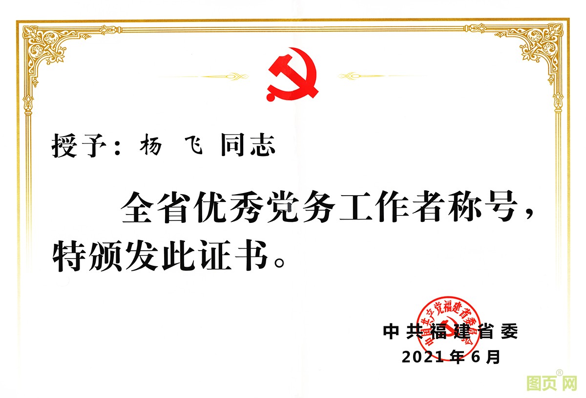 2021年6月中共福建省委授予支部 “福建省民营企业党建工作先进单位”荣誉称号(全省共50家民营企业党组织,其中南平市共4家民营企业党组织获此荣誉)、授予支部书记杨飞“全省优秀党务工作者”称号。