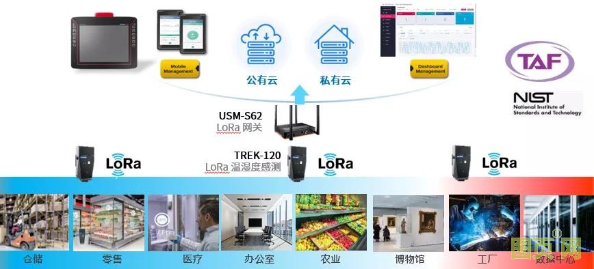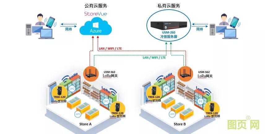 研华冷链管理是贯穿整个流程的全程冷链管理,无论是制造、运输、仓储、门店,还是药店与医院,都可以记录和管理。只需在相应点位安装研华温湿度传感器TREK-120,数据就可以通过LoRa发送到网关USM-S62,网关通过网络实时上传数据到云。管理者可以通过浏览器或电子邮件即时接收警报并监控整个冷链产品的状态。根据用户需求,可以选择私有云或公有云两种不同的系统架构。