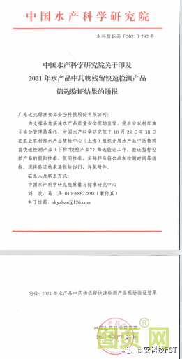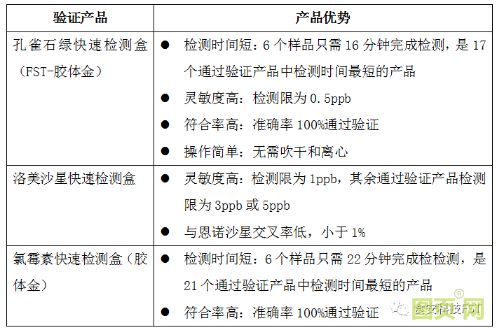 按照评价标准,现场验证结果是食安科技参与验证的孔雀石绿快速检测盒(FST-胶体金)、氯霉素快速检测盒(胶体金)、呋喃唑酮代谢物快速检测盒(胶体金)、呋喃西林代谢物快速检测盒(胶体金)、洛美沙星快速检测盒符合要求,通过了验证。