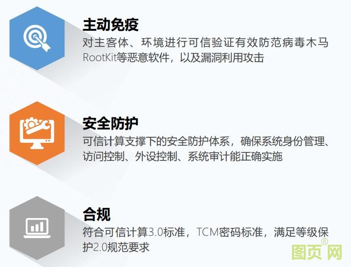 搭载国产X86架构的3230/3250 CPU,配合可信华泰可信计算3.0解决方案,满足等保2.0标准中可信验证的要求,具有高安全可控,高性能,通用性。