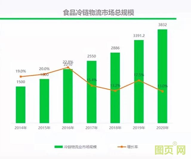 2019年,我国冷链物流市场规模为3391.2亿元,比上年增长505.2亿元,同比增幅17.5%。2020年我国冷链物流市场总规模为3832亿元,比2019年增长440.8亿元,同比增长13%,并且仍保持增长态势。