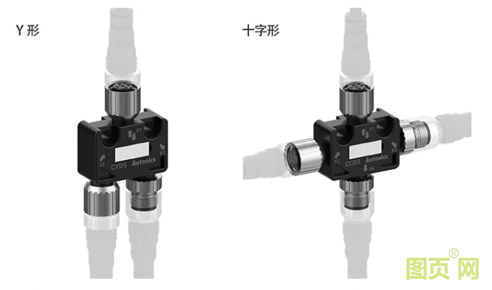 ▲配线引出接插型型号可通过使用连接器(Y形,十字形)和延长线缆来显著减少工时。当使用十字形连接器时,即使连接了多个安全非接触式开关,每个开关都将提供辅助输出以进行监控。