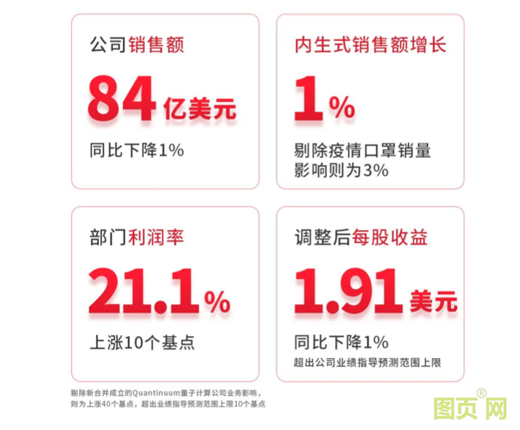 霍尼韦尔近日公布了2022年第一季度业绩。公司第一季度销售额为84亿美元,同比下降1%,内生式销售额增长1%,部门利润率上涨10个基点至21.1%。预计2022年全年销售额将在355亿美元到364亿美元,高于公司此前354亿美元到364亿美元预期。