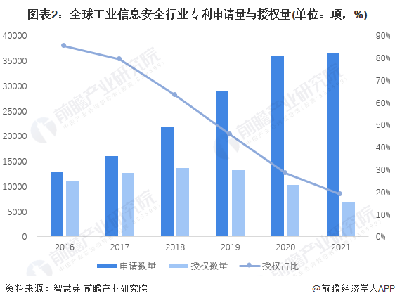 截至2022年6月23日,全球工业信息安全行业专利年授权数量为6923项,授权比重为18.97%,较2020年末进一步下降。