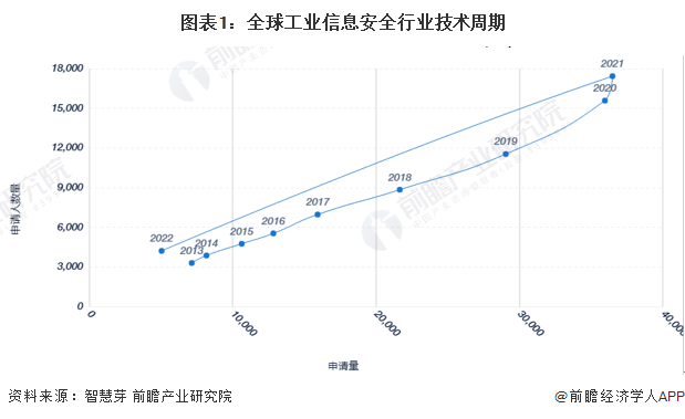 从技术周期的角度来看,全球工业信息安全行业专利申请人数量以及专利申请量均呈现增长态势。整体来看,全球工业信息安全行业技术处于成长期。