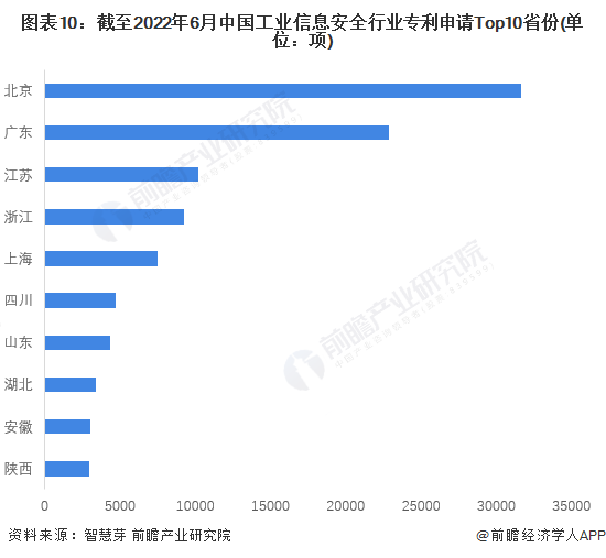 从我国工业信息安全行业专利申请数量的省份分布来看,北京省工业信息安全相关专利的申请数量最多,截至2022年6月23日,共计申请31676项;其次是广东省,共计申请22867项。