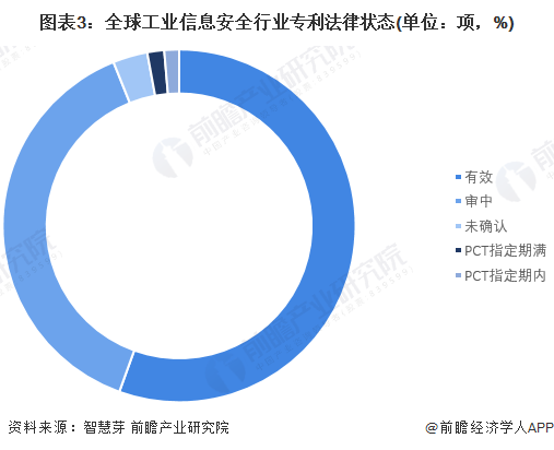 目前,全球工业信息安全行业共有118684项专利处于“有效”状态,占全部专利数量的55.51%;处于“审中”状态的有82147项,占比38.42%。