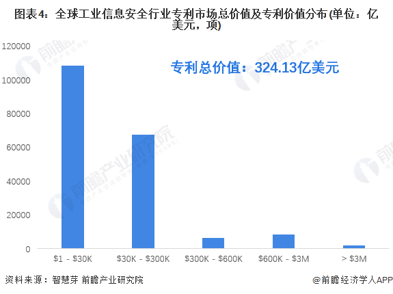 目前,从全球工业信息安全行业专利市场价值分布来看,大部分工业信息安全专利的市场价值在1-3万美元之间,在其余价值区间的专利数量为84594项,占专利总量的43.88%。