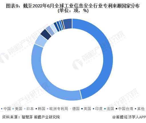目前,全球工业信息安全行业第一大技术来源国是中国,截止2022年6月23日,中国工业信息安全相关专利数量为145373项,占全球工业信息安全专利数量的46.09%。
