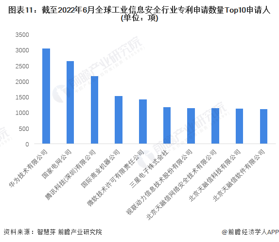 其中,华为技术有限公司工业信息安全专利申请数量最多,为3056项。国家电网公司排名第二,其工业信息安全专利申请数量为2652项。