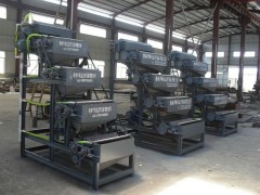 四辊湿式毛刷钨矿强磁磁选机(全磁360°磁系包裹)是上部给矿顺流式组合机型,矿石经料仓通过导料盘进入磁场区,磁性矿物被吸附在磁辊表面旋转到达精矿区,毛刷将吸附在磁辊表面上的磁性矿刷脱,在高压水的喷射下落到精矿斗里,部分未被吸附的磁性矿粒、非磁性矿粒和磁性较弱的矿粒由顺流磁辊下方的出料口排出,进入到下一级再选,从而达到分选的目的。