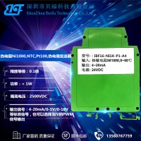 贝福科技研发的热电阻温度变送器产品主要用于Ni1000, NTC 10K, NTC 20K, Pt100,Pt1000,Pt10, Cu50,Cu100,热电偶J/ K/ T/ E/ R/ S/ B 型等传感器信号的隔离与变送 (传感器需用户自己配),在工业上主要用于测量各种温度信号。该变送器内有线性化和长线补偿功能,数据通过单片机算法处理,保证了输出信号和温度的精确对应,测量热电偶时,内置温度器,可以用于冷端补偿。出厂时按照国标分度表校正,完全达到0.1级精度要求。也可以根据用户提供的分度表进行特殊定制,满足客户的测量需求。输入、输出和辅助电源之间是完全隔离(三隔离),可以承受2500VDC的隔离耐压。